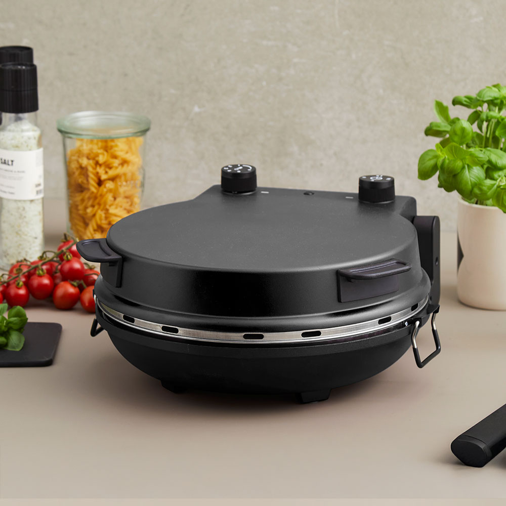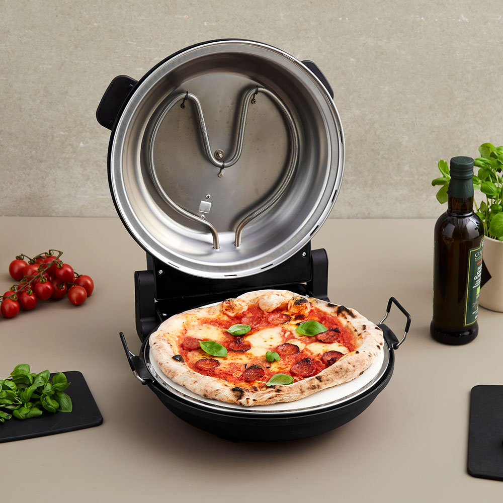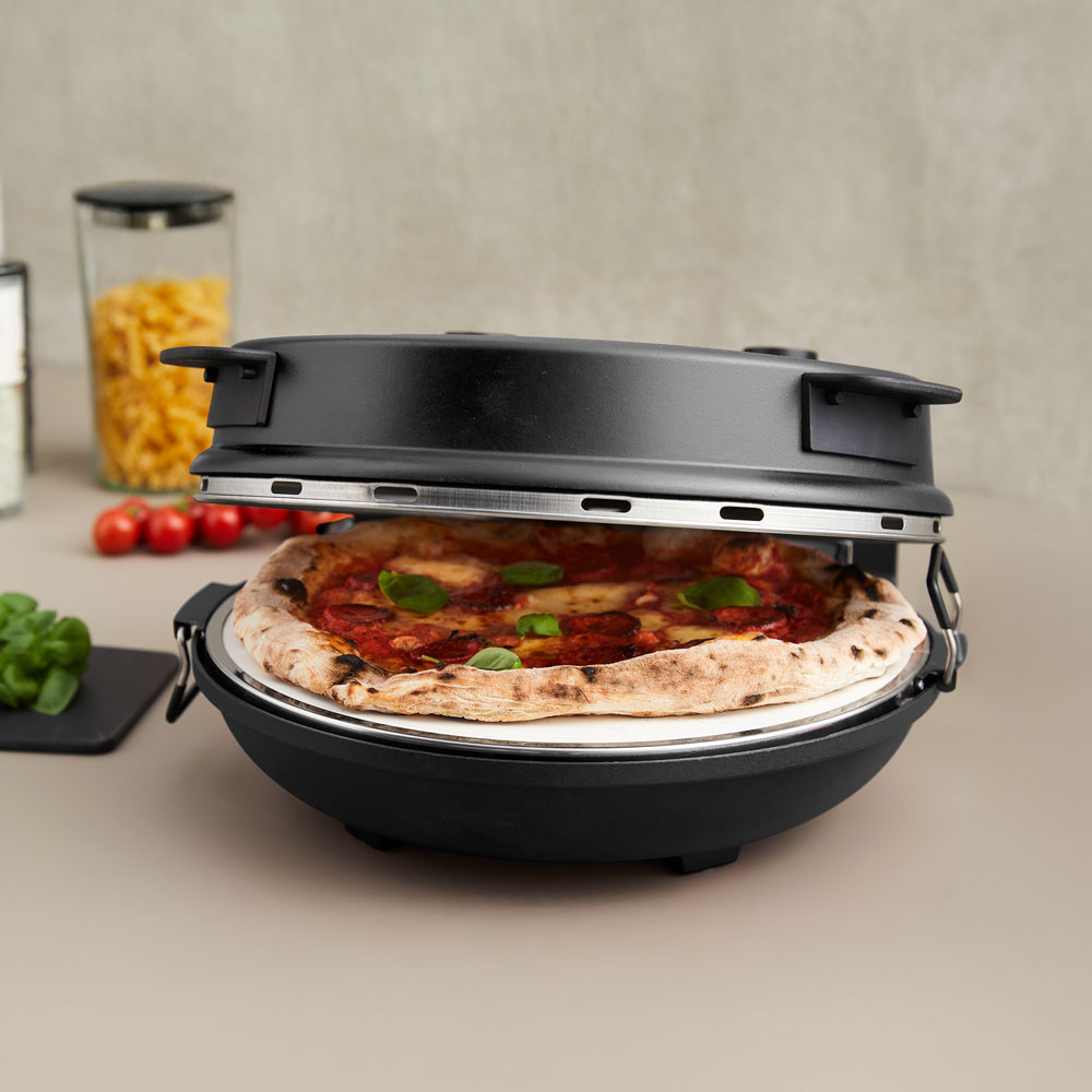 Den stilfulde ovn med aftagelig stenplade (Ø31,5 cm) sikrer en autentisk smag og sprød bund. Med justerbar temperatur op til 360°C og fem varmeindstillinger opnår du præcis den tilberedning, du ønsker.