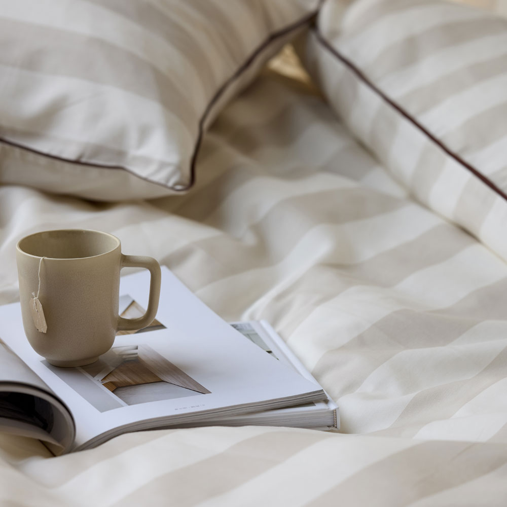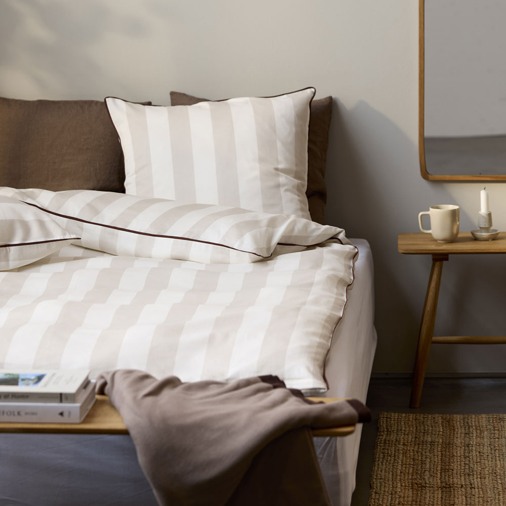 Ray fra Södahl forener klassisk elegance med kompromisløs komfort. Det tidløse stribemønster og den kontrastfarvede piping skaber et stilrent og eksklusivt udtryk, der løfter ethvert soveværelse.