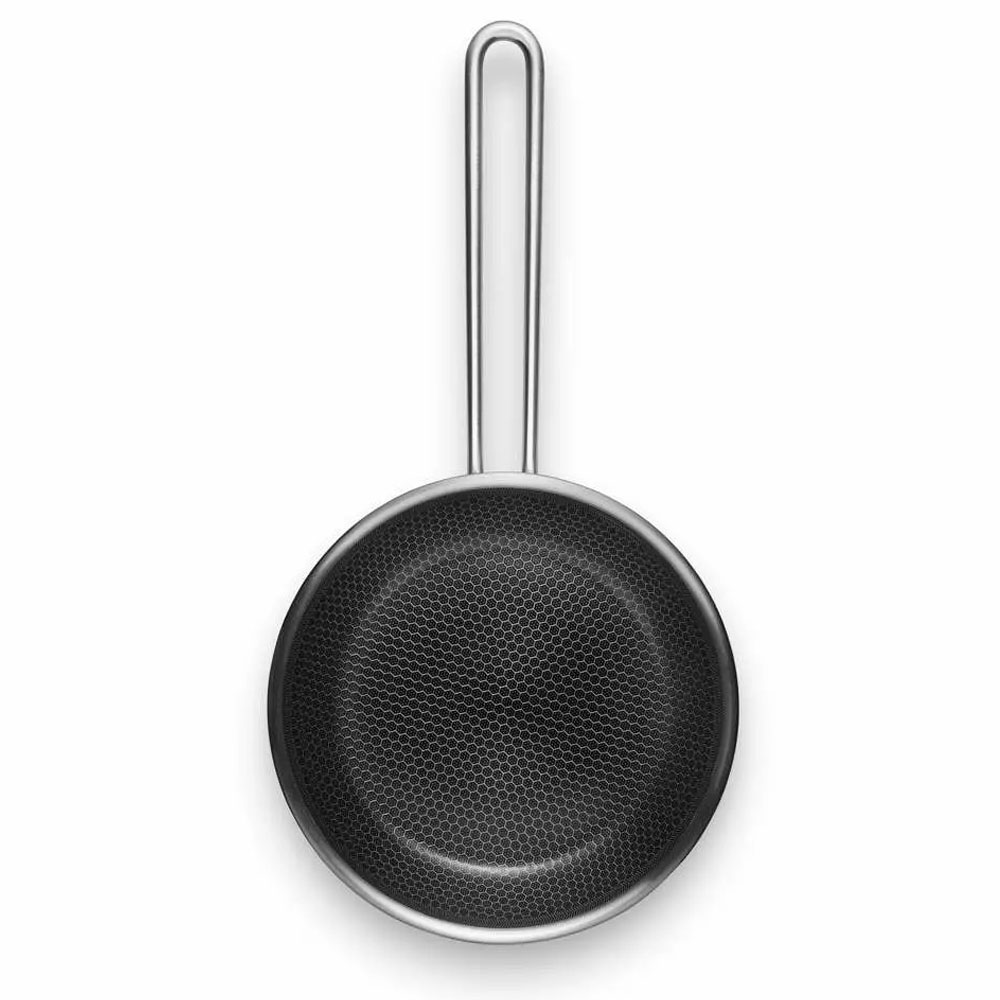Panden tåler metalredskaber uden risiko for at beskadige overfladen. Multi-layer 3-lags teknologien sikrer optimal varmefordeling og en slidstærk overflade, der modstår daglig brug. '