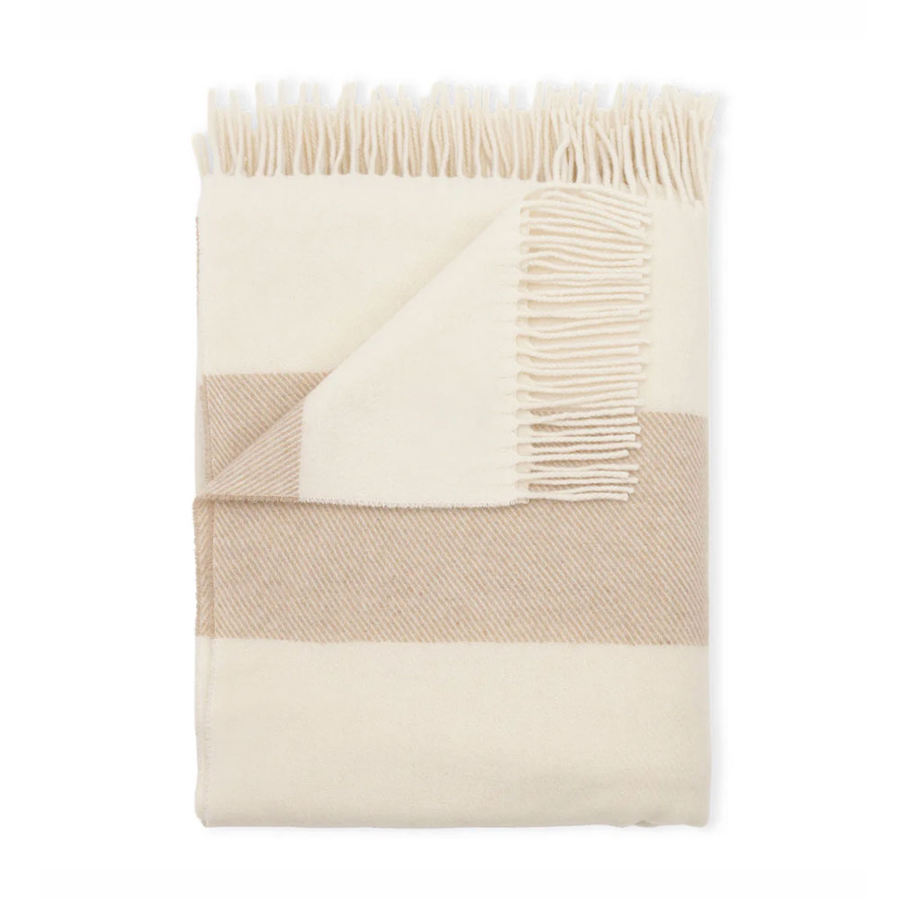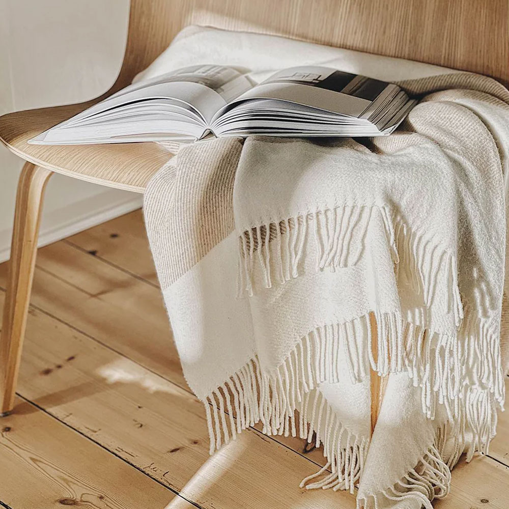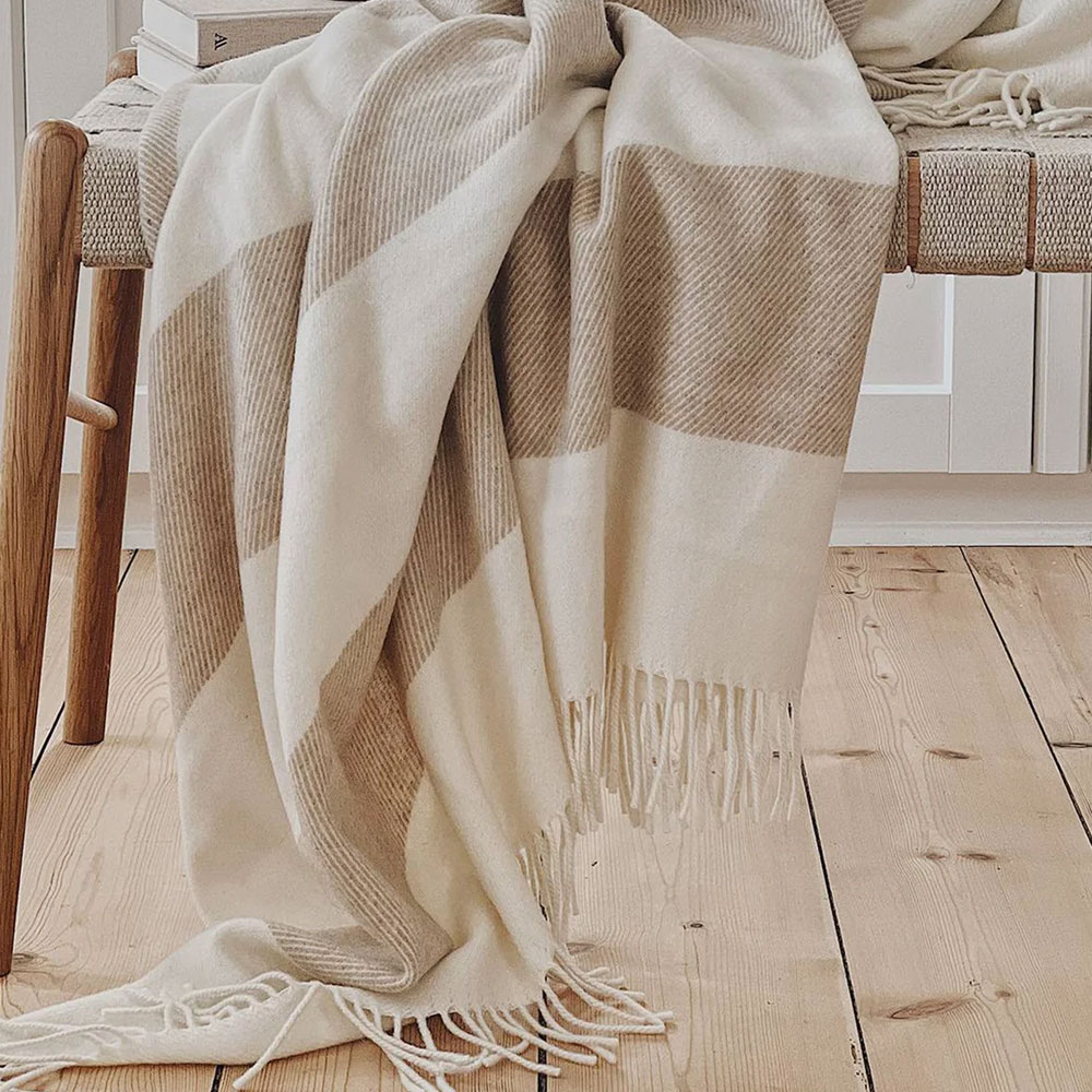Karla er en smuk plaid vævet i Italien af 100 % genanvendt uld – et naturligt og ansvarligt valg. Det klassiske design med brede striber og frynser giver et stilrent udtryk til hjemmet.