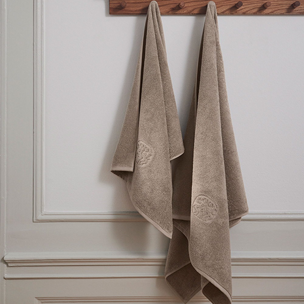 Georg Jensen Damasks klassiske Damask Terry håndklæder med indvævet logo, er håndklæder i fineste kvalitet, vævet på en jacquardvæv og i kæmmet bomuld, der giver styrke og blødhed, mens de dobbelttvundne garner giver et roligt og glat design.