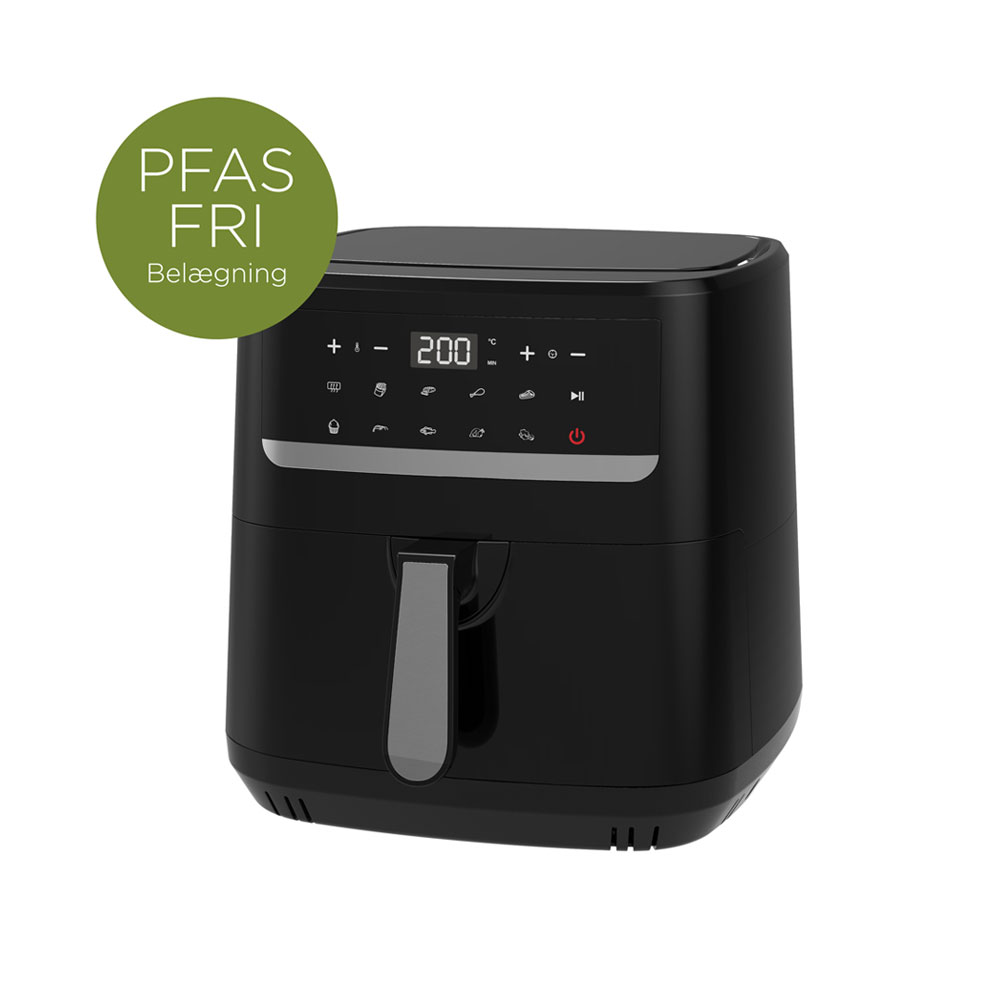 den indbyggede timer op til 60 minutter sikrer fuld kontrol. Det smarte filter reducerer røg og lugt, og den aftagelige PFAS-fri gryde gør rengøringen let.