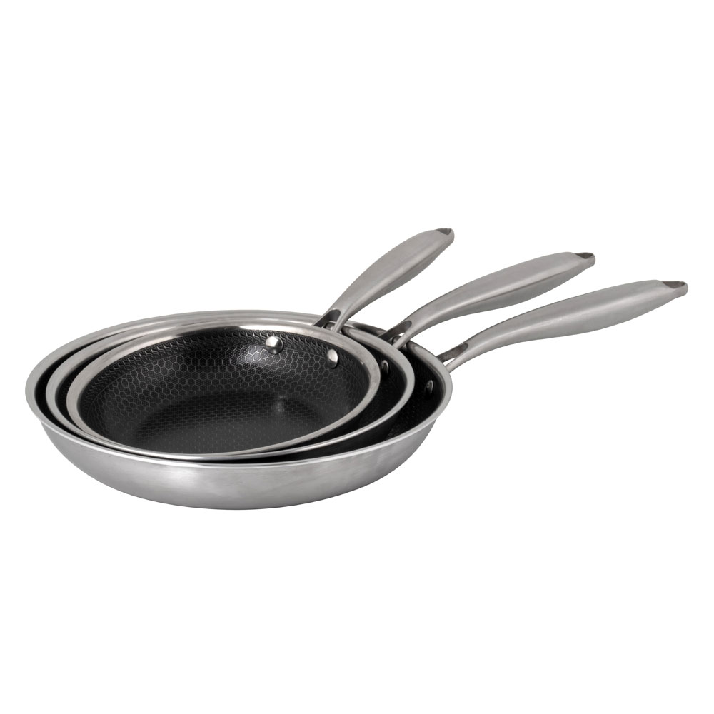 Dette sæt med tre pander i mat rustfrit stål kombinerer stil, holdbarhed